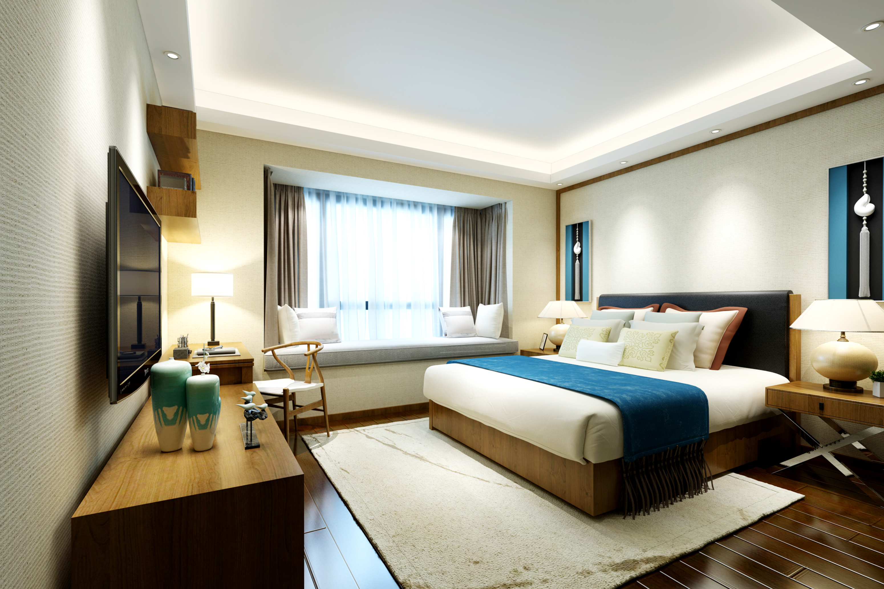 臥室的功能主要是睡覺、休息,繁雜的裝飾會讓人思緒復雜,且心情煩躁,不利于休息。另外,臥室屬私人空間,不向客人開放,所以臥室裝修也沒有必要有過多的造型,通常也不需吊頂,墻壁的處理越簡潔越好,通常刷乳膠漆即可,床頭上的墻壁可適當做點造型和點綴。臥室的壁飾不宜過多,還應與墻壁材料和家具搭配得當。