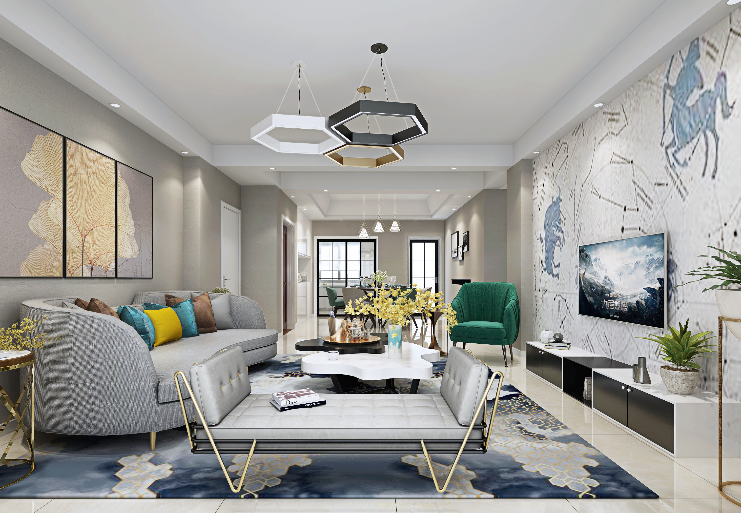 以一個三人客廳沙發(fā)為主,周圍布置單人客廳沙發(fā)、單椅,讓平面疏密有度,營造一個輕松的會客氛圍。