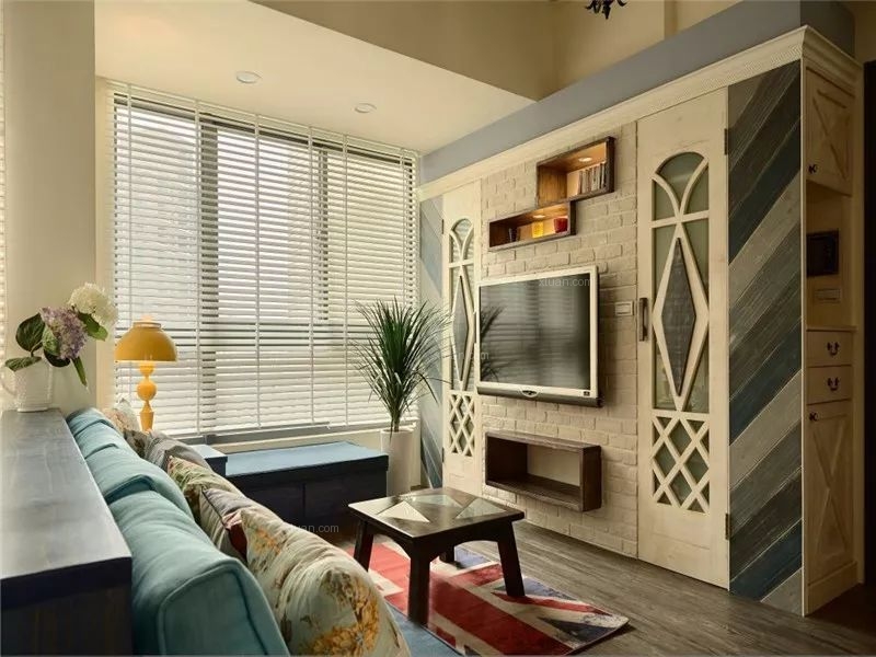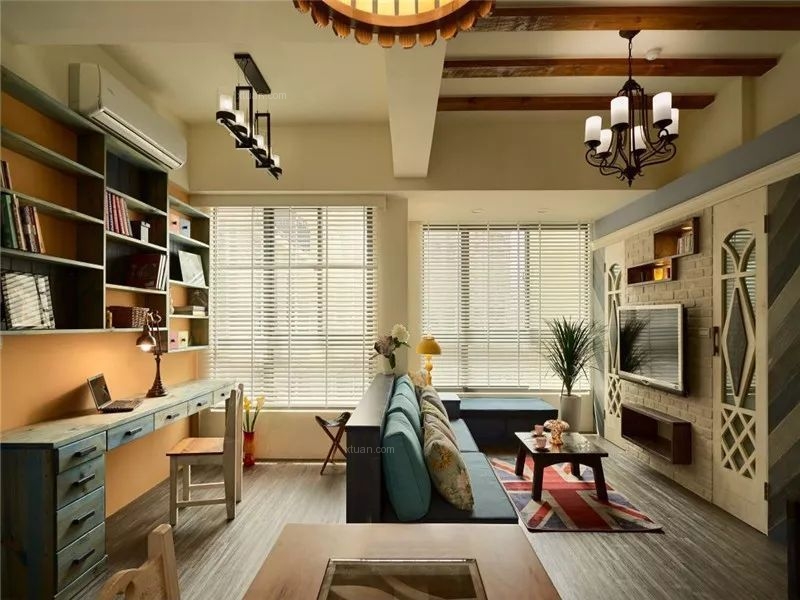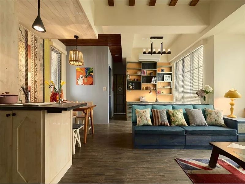 快節奏、繁華的城市當中,總希望有安靜的棲息之地,感受到安逸舒適自由的生活,深色地板結合彩色家居搭配結合,空間區域對比劃分明確,使空間充滿世外桃源之感,水藍色的美式沙發拉高客廳清爽度,搭配國旗圖樣的地氈與碎花抱枕,增添度假風格。